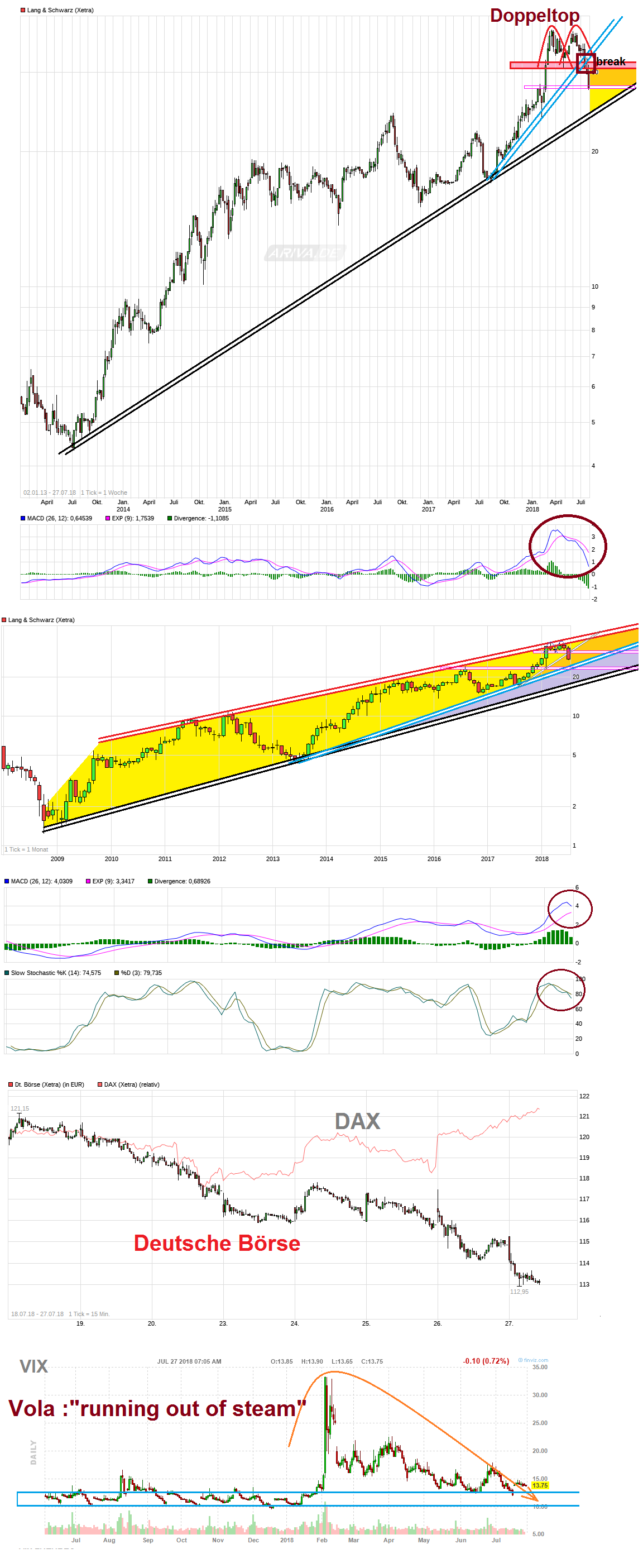 Was den Kurs im 1.Hj. angetrieben hatte, war die extreme Vola im Frühjahr, die unerwartet hohe Gewinne einbrachte. In der Euphorie war mancher Anleger wohl etwas von dem Gedanken etwas berauscht so geht es locker weiter. Und die hohe Div hat auch nicht wenige Leute davon abgehalten doch früher Gewinne mitzunehmen als man noch hoch in der Region 35/37 war. Aber schon damals war eigentlich erkennbar, daß die Überkauftheit extrem ist und der drohende Korrekturbedarf nicht klein sein sollte (Blick auf den MACD). Wie man sieht geht die extreme Vola von Feb./März zügig wieder Richtung tiefe Regionen zurück. Niemand kann sagen, wann sie wieder deutlicher anspringt. Die Ausbildung eines Doppeltops und der Break des seit 2017 steigenden Aufw.trends hat jüngst weitere negative Signale erzeugt und so wohl weitere Verkäufe mitinduziert. Nächster Auf.trend wäre der aus dem Jahre 2013 und der liegt noch immer ein gutes Stück unter dem aktuellen Kurs. Von daher muß man mal abwarten wie weit man sich jetzt "austoben" wird. Die Deutsche Börse hatte vor einigen Tagen Superzahlen rausgebracht, deren Aktienkurs ist seitdem trotzdem deutlich unter Druck. Zeigt, daß starke Zahlen für Q.2 keine Garantie sind, daß man darauf positiv reagiert, weil man offenbar für das 2.Hj. dann doch jetzt eher wieder mit "ruhigeren Zeiten" rechnet, was eher kontraproduktiv ist für Werte wie Deutsche Börse, Lang undSchwarz, etc. Von daher mal abwarten was das Zahlenwerk von LuS bringen wird Ende August und ob nicht vielleicht im Herbst die Vola doch nochmal " auflodert" und man dann wieder Nutznießer wäre. Jedenfalls signalisieren die Indikatoren gegenwärtig noch keine Kauf-/Umkehrsignale.