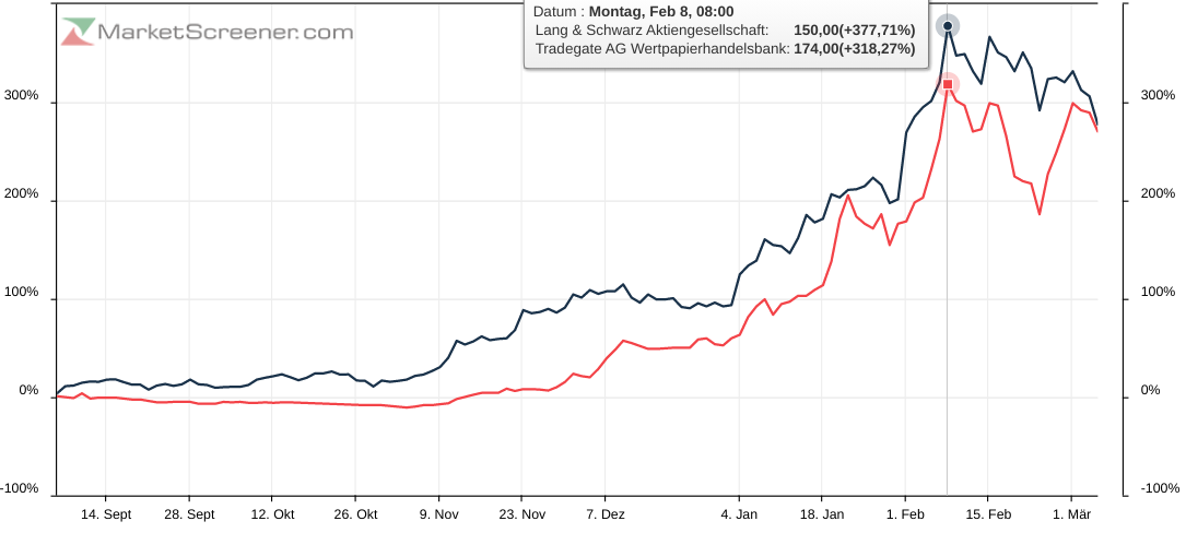unten 6M-chart: L&S (schwarz) vs. TRADEGATE AG WERTPAPIERHANDELSBANK (rot)