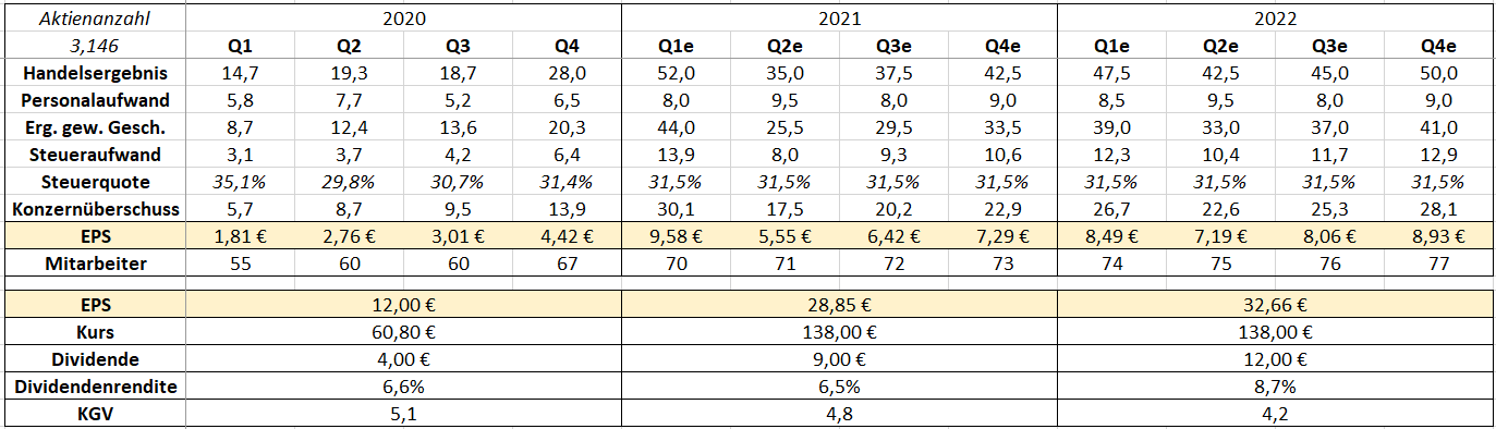 Sollte sich das Wachstum aber über mehrere Jahre verstetigen (ähnlich wie bei Tradegate in den letzten 5 - 10 Jahren), könnte ich mir vorstellen, dass der Markt L&S auch durchaus mal mit einem KGV von 20 bewertet. Wäre dann ein Kurs von 1.000€ in 3 - 4 Jahren. Zum Vergleich: das historische KGV von Tradegate liegt irgendwo zwischen 30 und 40. Ein Kurs von 1.000€ Hört sich jetzt viel an, ganz an den Haaren herbeigezogen ist es aber auch nicht. Wenn der Markt auch nur annähernd so wächst wie aktuell von FlatEx, Trade Republic, Baader oder smartbroker erwartet wird, wird sich L&S davon ein ziemlich großes Stück abschneiden können und wir werden noch eine Menge Freude mit der Aktie haben.