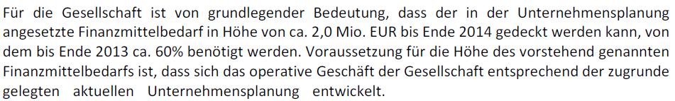 Textlich erscheint es mir so, dass die benannten 2 Mill. ab dem 2. Halbjahr bis (geschätzt) Ende 2014 definitiv! erforderlich sind (eventuell auch mehr). davon 60% = mind.1.2 Mill. werden schon bis Ende ´13 gebraucht, somit sind (für mich) alle Beträge, die nach dem 01.07. aus Kapitalerhöhungen kamen, temporär dem benannten Kapital-Bedarf zuzuordnen.