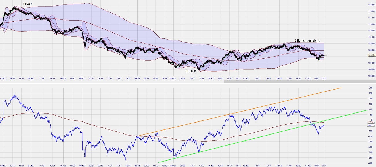 Darf man auch von den 11000 ausgehen, denn wir sind gerade mal 170 Pkt davon entfernt. Trotzdem scheint es ein husarenakt zu sein, diese mal ernsthaft anzugehen. Der Vorteil den dax soweit unten zu halten besonders für Fonds uns andere anlageinstitute ist natürlich die Tatsache, dass die für das nächste Jahr mit 10 - 15% renditen werben können. Od diese kommen, bleibt natürlich in den Sternen. Aber der dax wird kaum über die 11200 nächstes Jahr kommen.
