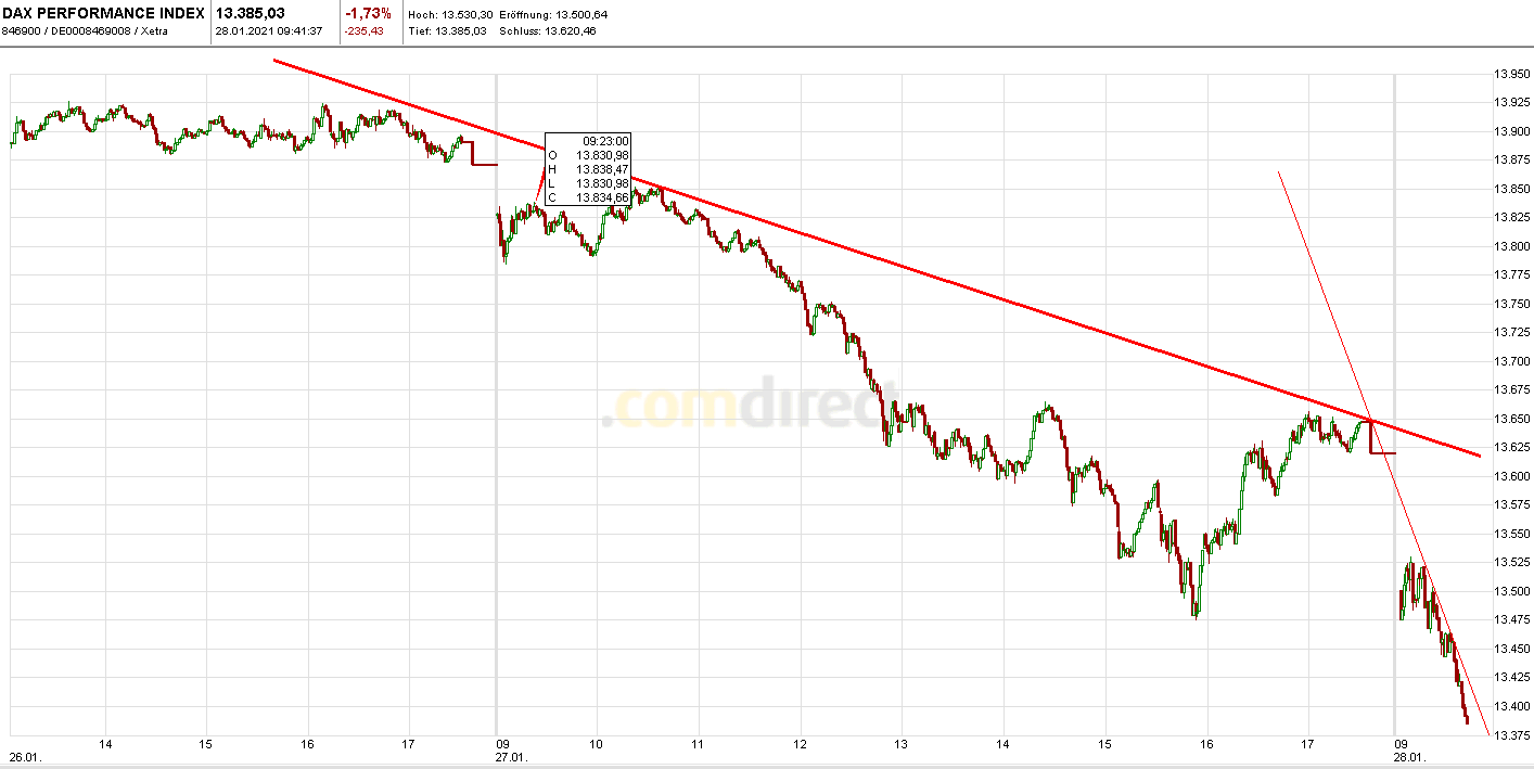 ... Unter 13365 rechne ich mit einer schnellen Annäherung an die zahlreichen Tiefs bei DAX 13000 und an die rote 200 Tage Linie (EMA200) bei 12865 bzw. bis zum Gap bei 12600, wo auch die pinke SMA200 im Tageschart verläuft. www.godmode-trader.de/analyse/...ation-zum-tagesstart,9156704