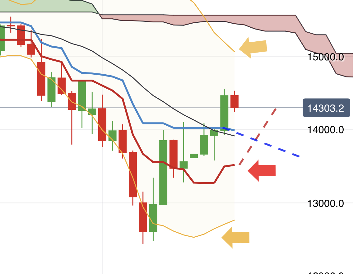 Gemessen am Aufwärtstrendkanal ist der DAX überkauft und könnte vor Kontakt mit 14.815 jederzeit bis 14.250 oder 14.100/14.025 fallen, um dann wieder zu steigen.
