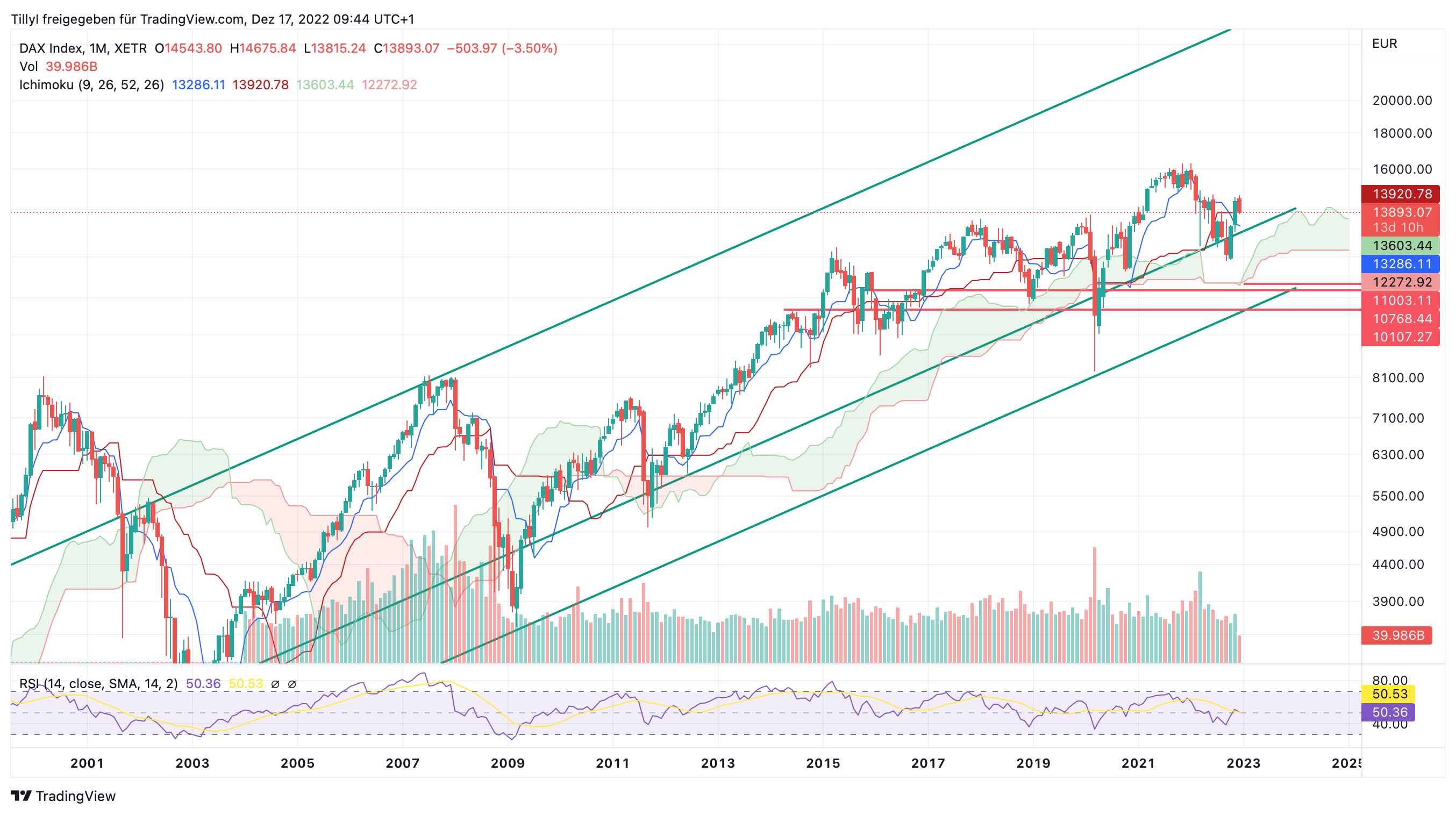 Wenn ich mir mein Big Picture Chart nehme, den schon mal gezeigten log- Monatschart, dann sehe ich ungefähr Dein Ziel beim Ichiwolken Boden. Denken wir mal nach unten, dann wäre im Dez 23 der Schnittpunkt der bisherigen "Crash" Linie mit einem interessanten Widerstandsbereich bei etwa tiefer ca. 10700.