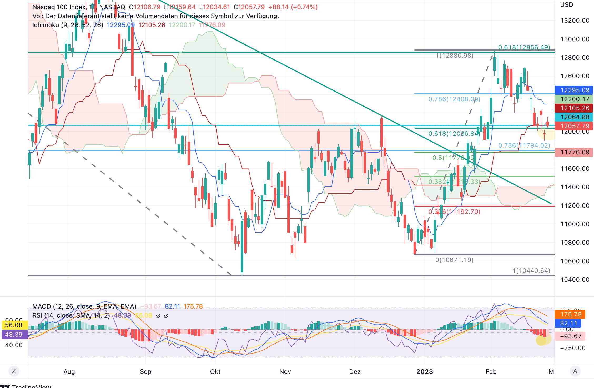 Zumindest Augen auf auf Tagessicht, der Nasdaq hat den kurzfristigen bullischen Fibo (gelb 1) und eine wichtige Unterstützung wieder, die Indikatoren (gelb 2) legen eine Umkehrbewegung nahe. Da der Wochenchart diesbzgl. anders aussieht spekuliere ich, dass der Nasi ein Doppeltop machen könnte. Kurzfristig könnte meiner Meinung nach also die 12900 erneut Ziel werden, wenn die nicht durchbrochen wird, noch mehr Spekulation, könnte es größer runter gehen.
