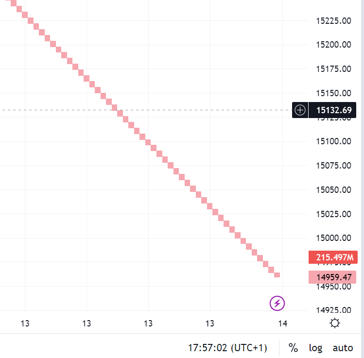 Heute sieht man dass die 15000er Marke umkämpft wird, ein kurzer Dip darunter wurde gekauft...
