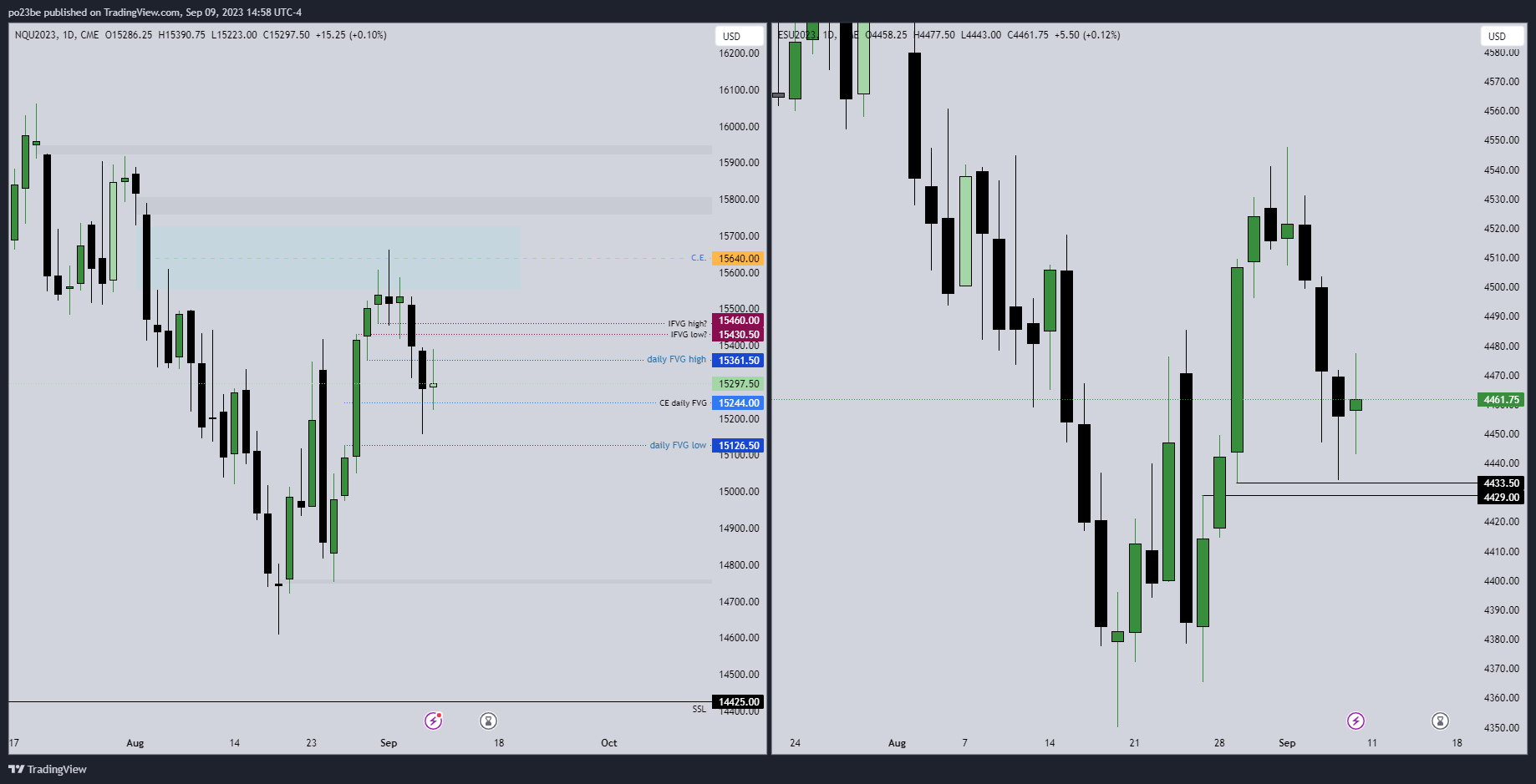 NQ (Nasdaq Future) würde ich gerne Richtung 15126,5 sehen. Der ES (S&P Future) hat diese Tagescandle vom 29. August bereits komplett rebalanced. Darunter hat der ES noch ein daily FVG offen (4429-4433,5).