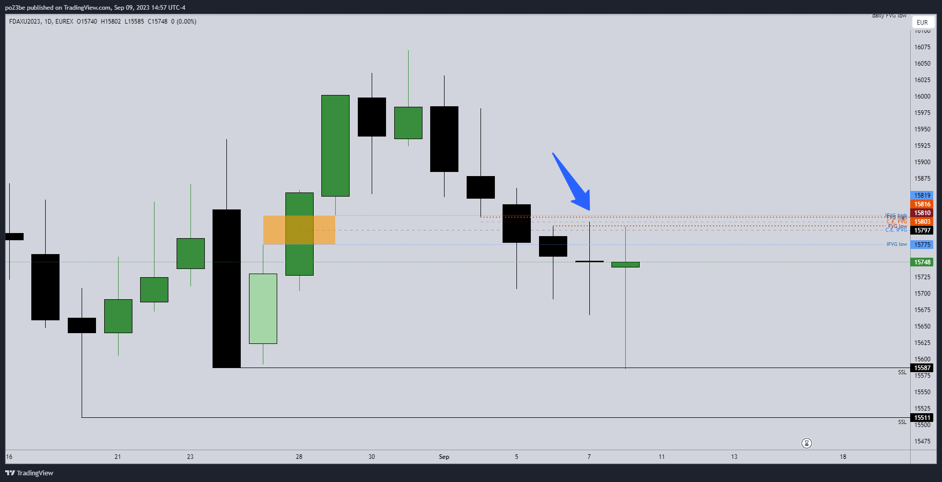 Sofern es beim Fdax kein Tagesclosing über dem inverse-FVG (habe es mit einem orangenen Rechteck gekennzeichnet) gibt, bevorzuge ich die Shortseite. Am Freitag hat er das swing-low vom 24. August unterschritten (2 Punkte), darunter liegen sell-stops, daher auch die Reaktion nach oben.. Jetzt könnte er über das swing-high (blauer Pfeil, Hoch vom 07. September) laufen und dann sofort wieder nach unten abdrehen (Wunschvorstellung)
