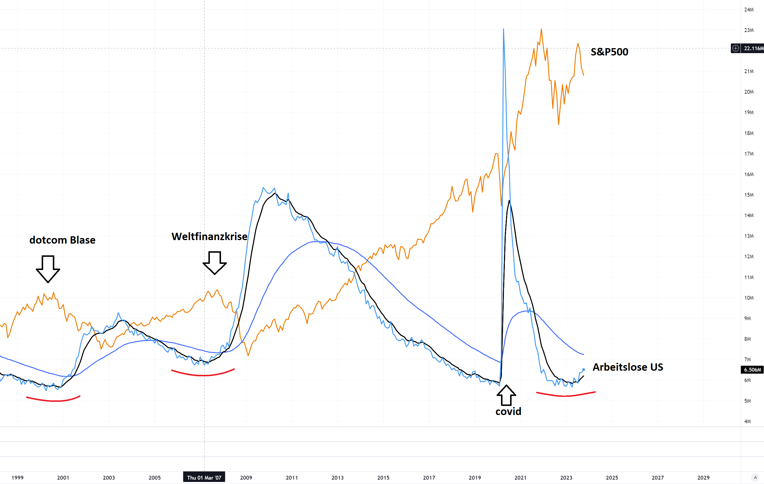 Interessant ist ja das wir ne umgekehrte Zinskurve haben und das ja oft einher geht mit einer Rezession. Die Zinskurve kann man aber ein schlechter Ratgeber wenn es ums Timing geht. Die Zahl der US Arbeitslosen ist besser geeignet. Aktuell steigend und das passt ziemlich gut zur Zinskurve.