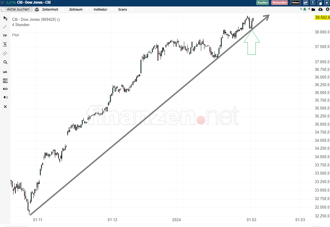 Man hätte es eh so schön gesehen, dass er nur bis zur Trendlinie herunter kommen wird.