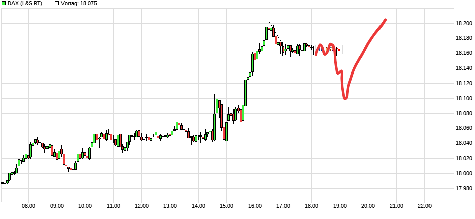 Es gab keine tieferen Tiefs, tieferen Hochs, stattdessen, ausgehend vom potenziellen höheren Tief 17800 befinden wir uns wieder auf dem Weg zum b-Hoch 182xx