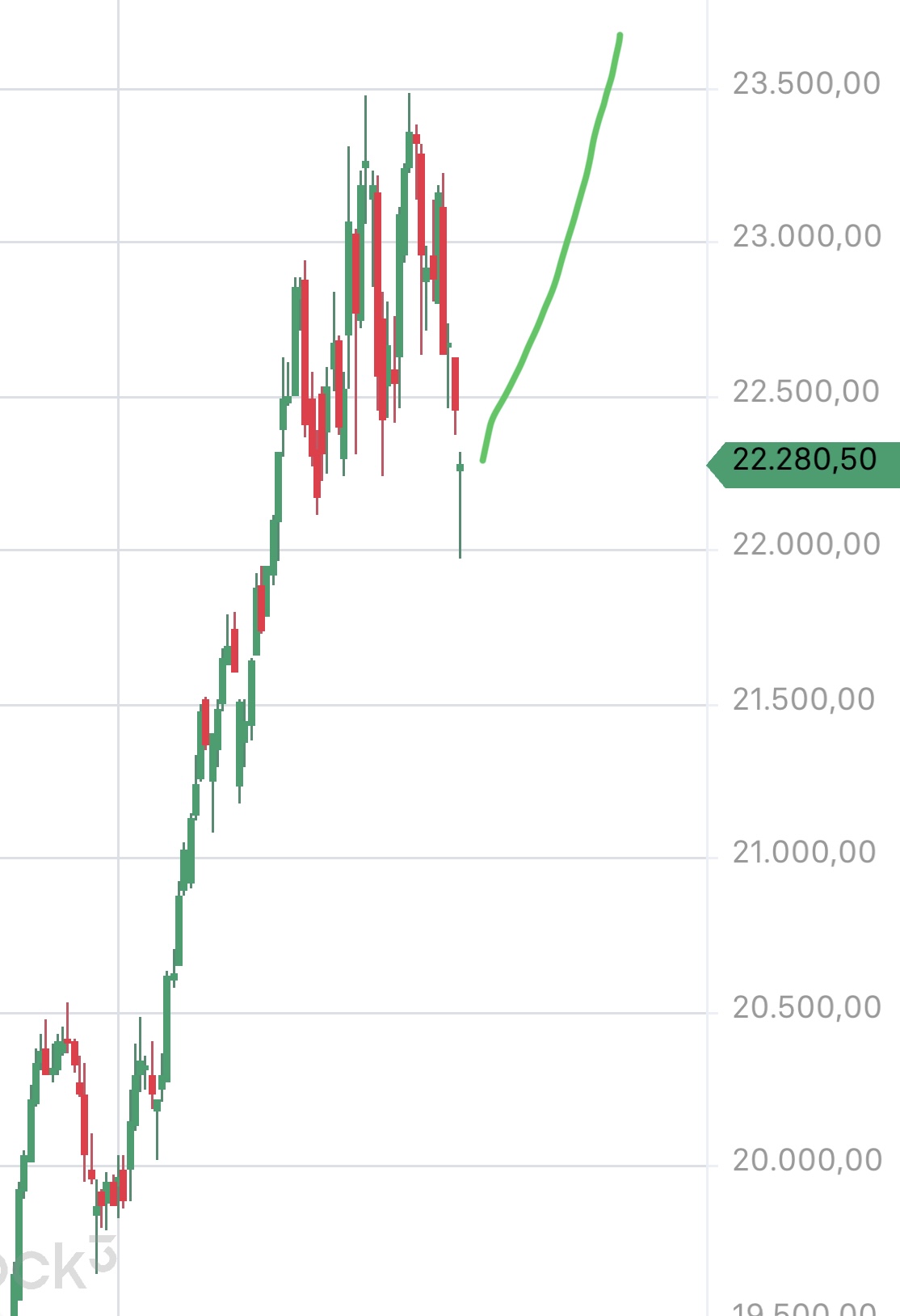 das ist auch meine sicht, rückläufe wird es geben und von der 22k aus bzw. knapp drunter ein super crv für nen long versuch. dennoch bleibt meine annahme, oben doppeltop, kein neues ath vor der sommerpause. rückläufe können durchaus 22850 und etwas höher erreichen. aber kein neues ath.