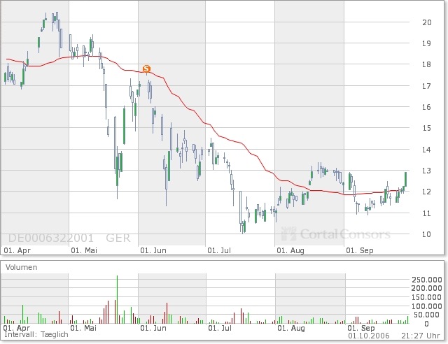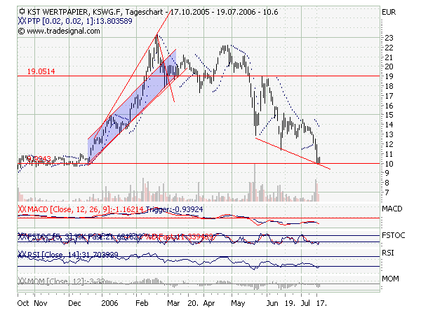 Der Kurs der Beteiligung ist seit dem 14. Juni 2006 gestiegen während KST diese Bewegung noch nicht richtig nachvollzogen hat. Das Managment von KST gibt ja selber zu das in den letzten 2 Monaten des Halbjahresabschluss bei diesem Börsenumfeld keib zusätzlicher Gewinn gemacht wurde. Ich denke nachdem der Markt gerade wieder anzieht wird sich die Lage auch sehr schnell ändern und die Ziel der KST sind immer noch erreichbar und nicht zu hoch gesteckt.
