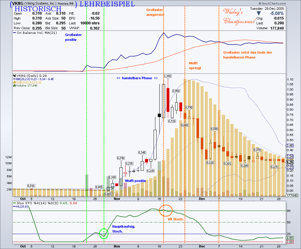 Anhand des Histogramms kann man den Handelszeitpunkt/Kurs noch besser navigieren, als nur mit den MACD Linien allein. Denn man sieht einerseits, ab wann sich der Bauch beginnt nach oben zu verringern und weiß, dass man auf dem Weg zum nächsten positiven Wendepunkt (Linienschnitt) bereits ist... andererseits weiß man wenn das Histogramm maximal nach oben ausgeformt ist, also die höchste Treppenstuffe erreicht hat und sich beginnt abzubauen, dass dies die besten Gewinnmitnahmekurse sind, ggf. noch weit bevor das eigentliche Signal kommt (Nulldurchtritt des Histogramms / Schnittpunkt der MACD Linie und ihres Begleiters) Der letzte Histogramm"Berg" hatte seinen Gipfel bei .42 Cent Kurs im August... ein kurzfristiger Händler ist da raus... manchmal ist es dennoch kniffelig den endgültigen Gipfel herauszuarbeiten, denn wie man im März/April sieht, hatten wir einen Gipfel bei 54 Cent Kurs. Einen weiteren bei 58 Cent, dazwischen kam aber kein MACD VK Signal, sondern der Folgehügel bildete sich ohne 0 Durchtritt, in starken Trendphasen üblich... womit wieder deutlich wird, dass Interpreationsspielraum bleibt und alle Gefährten zusammen bestimmen, ob grünes Licht für eine entsprechende Entscheidung gegeben wird...