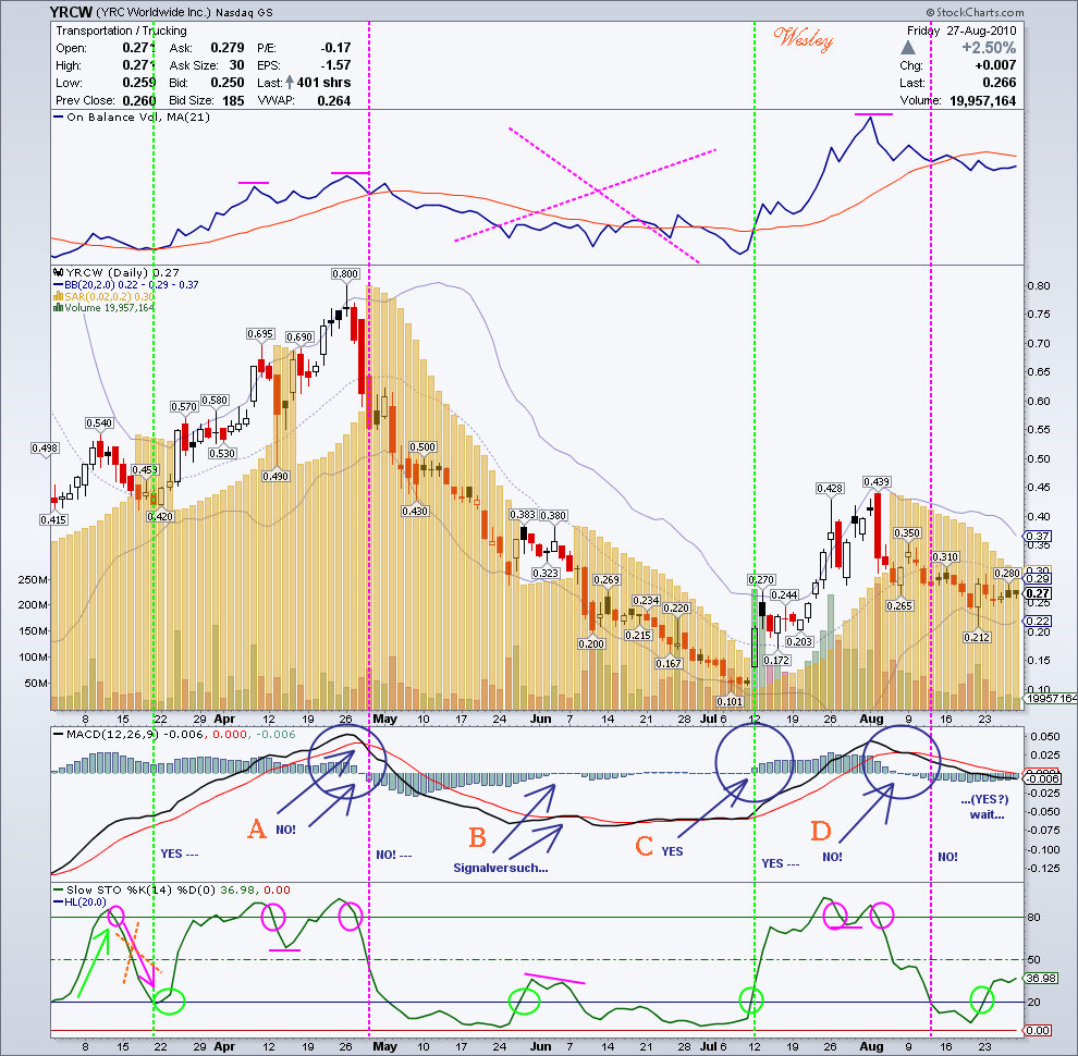 Das Histogramm stellt nichts anderes als den Grad der Spreizung der MACD Linie und ihres Begleiters graphisch dar. Kommt es zum Kaufsignal, schneiden sich MACD und Begleiter (schwarz/rot) ihre Differenz ist 0 die Balkenhöhe des Histogramms ist ebenfalls 0 (vgl. Punkt "A") verändert sich die Spreizung der MACD Linie zu ihrem Begleiter negativ also nach einem Verkaufsignal weitergehend... beginnen die Balken nach unten schrittweise hinauszutreten (vgl. nach A) sie bleiben so lange negativ (unter der 0 Linie =Horizintale) bis zum nächsten Kaufsignal. Um nun absehen zu können, wann dies erscheinen könnte, betrachtet man die Veränderung der Spreizung der roten und schwarzen Linien genau, ab einem estimmten Punkt wird sie sich wieder verringern, das ist der Punkt an dem das Histogramm maximal nach unten ausgebaucht ist, nun nähert es sich langsam der 0 Linie von unten, in diesem Beispiel YRCW, bis zum Fehlsignal im Juni bei "B". Es kommt aber zu keinem vernünftigen Kaufsignal, die Balken bleiben bei sehr geringen Höhen (B).