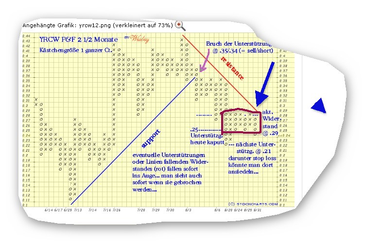 jedenfalls sieht man dann die Rückkehr zum support und das etablieren einer neuen X-Säule... der stoploss rückt unter das O = .28 und die X'se laufen bis .41 hoch so und nun kommt die Zeit... an der es Koffer packen heißt... eine O-Säule fallender Kurse verletzt den support... und durchschneidet ihn, es etabliert sich eine Linie fallender Widerstände (rot)... im Prinzip bis heute... in einer solchen Chartphase, hat der P&F Chartist, sich, ich setze es mal in Klammern, da keine Empfehlung (im Prinzip fern zu halten...) ;-) solange bis die Linie fallender Widerstände wieder aufgehoben würde... ich spreche jetzt nur von P&F Chartisten, nicht von denen, die von der Firma überzeugt sind... :-)
