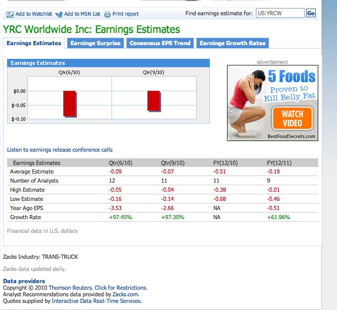 YRC Worldwide Inc. (NASDAQ: YRCW) is scheduled to release second-quarter earnings before the market open on Tuesday, August 3, 2010. Analysts, on average, expect the company to post a loss of 8 cents per share on revenue of $1.19 billion. In the year-ago period, the company posted a loss of $3.53 per share on revenue of $1.33 billion.