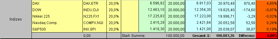 Meinem Mindestzielwert von 25% für das Depot bin ich schon nahe. Auf Hebel mittels Calls, KOs und ähnlichem hatte ich bewußt verzichtet.