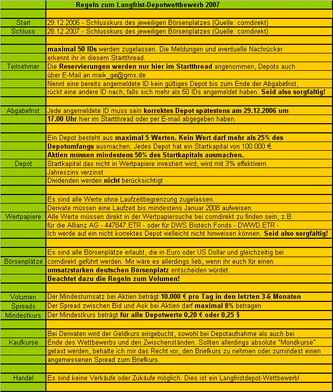 Es gibt ein paar wenige Regeländerungen, die alle in der angehängten Graphik abgebildet sind. Die IDs, die also an diesem Depotvergleich teilnehmen wollen, sollten sich diese Regeln genau durchlesen! Unter Umständen kann ich darauf nicht frühzeitig genug noch einmal hinweisen, falls sich bei jemandem Fehler eingeschlichen haben.