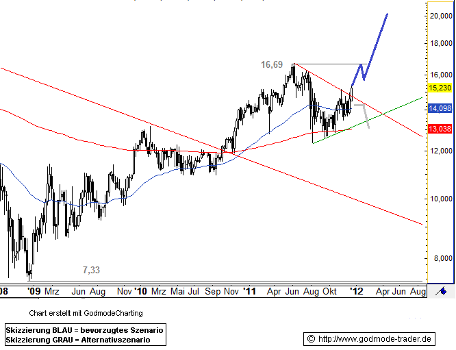 Die Aktie von Carl Zeiss Meditec fiel im Dezember 2008 auf ein Tief bei 7,33 Euro zurück. Nach diesem Tief setzte eine starke Aufwärtsbewegung ein, welche bis Anfang Juni 2011 andauerte. Die Aktie kletterte dabei auf ein Hoch bei 16,69 Euro. Danach setzte eine Konsolidierung ein, welche die Aktie auf 12,36 Euro führte. Seit diesem Tief von Anfang August zieht die Aktie bereits wieder an. in dieser Woche durchbricht sie den Abwärtstrend seit Juni bei 14,77 Euro. Damit ergibt sich ein neues Kaufsignal.