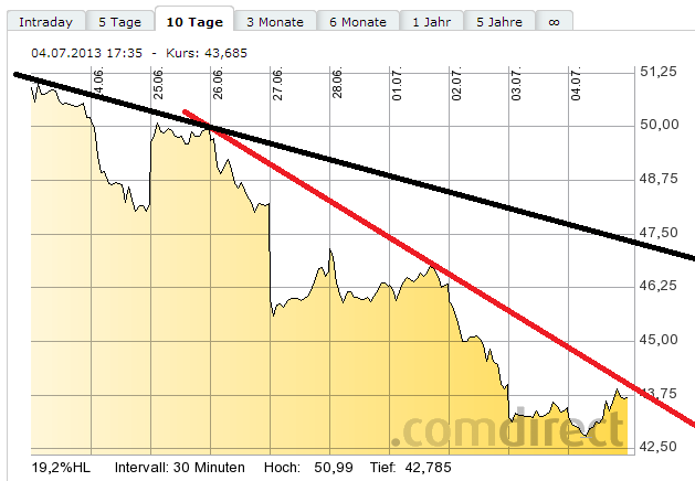 Morgen entscheidet es sich... der sehr steile kurzfristige Abwärtstrend hat bei ca. 44 seinen Deckel, sollte es da durch gehen dann ist Platz bis ca. 46,50/47 je nach Zeitspanne bis wir an die Oberkante stoßen. Eigentlich muss es jetzt hochgehen, ich meine von 58 auf 42,60 in 4 Wochen, das ist definitiv zu viel des guten. Brechen wir morgen über 44/45 aus hätten wir vielleicht voerst auch mal einen Doppelboden bei ca. 42,60 gesehen.