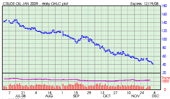 Am Donnerstag war die Option mit einem Ausübungspreis von 30 $ zur Lieferung im Februar 2009 an der New Yorker Energiebörse Nymex der am zweithäufigsten gehandelte Kontrakt. 1407 Transaktionen wurden durchgeführt. Das heißt zwar nicht, dass ein Preis von 30 $ wahrscheinlich ist. Jedoch deutet es daraufhin, dass sich die Investoren gegen solch ein Szenario absichern wollen.