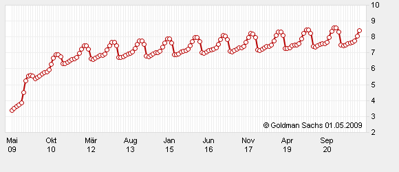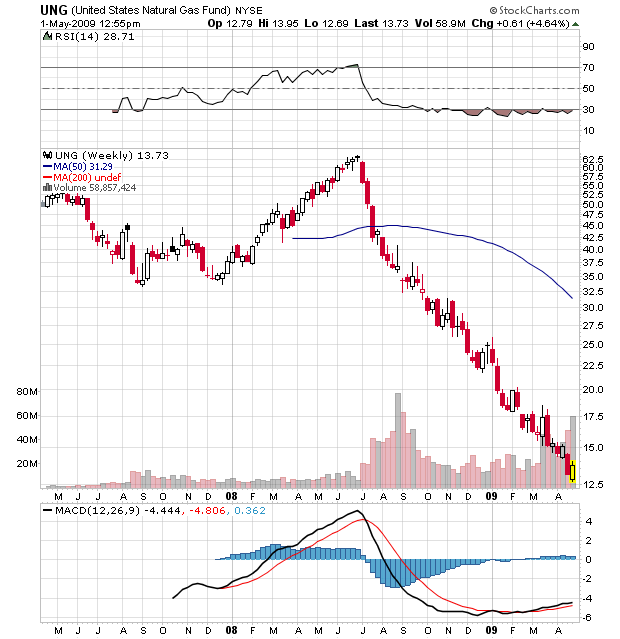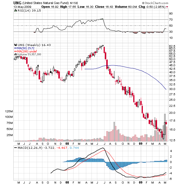 Hintergrund für die UNG-Anstiege sind vor allem Trader, die sich letzte Woche auf den börsennotierten ETF "UNG" stürzten. (UNG kann man an US-Börsen wie eine Aktie kaufen, es gab mehrere Kaufempfehlungen.) Öl und andere Rohstoffe stiegen übrigens parallel dazu - und Öl sogar noch stärker. Grund: US-Medien verbreiten unverdrossen die frohe Kunde, dass "die Krise überwunden" sei und daher auch die Rohstoffpreise demnächst wieder anziehen müssten. Für Trader Grund genug, dies jetzt schon mal vorwegzunehmen und spekulativ long zu gehen (wiewohl es für die wirtschaftliche Erholung in USA kaum Anzeichen gibt - sinkende Sinkraten sind kein Wendesignal).