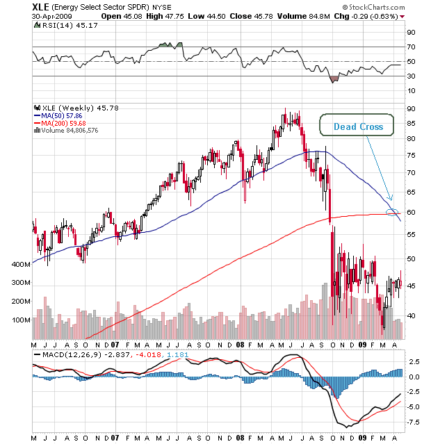 Nicht nur Exxon, sondern der gesamte US-Energiesektor leidet in der Rezession. Hier der Chart von XLE (Subindex Energie des SP-500):