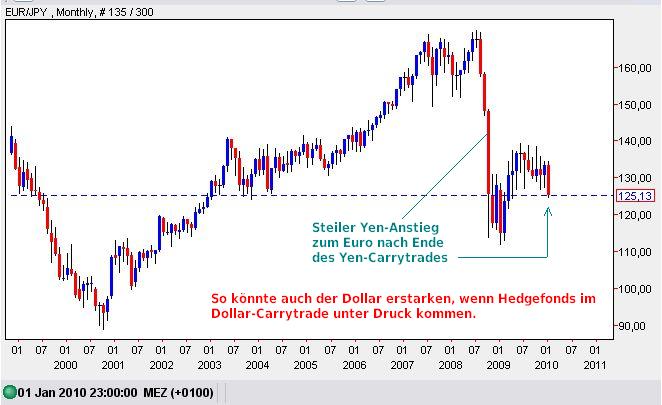 Also muß der Anstoß wieder einmal vom Export kommen. Eine Belebung läßt sich ja bereits wieder , vor allem in Fernost feststellen. Indien läuft auch ohne Konjunkturprogramm, weil es dort keinen Absturz der Finanzwirtschaft gegeben hat. In China hat es nach Beträgen die mächtigsten Konjunkturprogramme gegeben, die Finanzwirtschaft war ebenfalls nicht betroffen, sodaß die Stützung im Gegensatz zu den USA dort in die Fabriken fließen kann. Es ist dennoch fraglich , ob China alleine die neue Konjunkturlokomotive bilden kann. Die Krux beim Export stellen jedoch die Wechselkurs dar. Sollte der $ aufgrund der hohen Staatsverschuldung wieder beginnen, abzurutschen, so bricht auch der Export bei uns ein. Als Konsequenz erwarte ich daher, daß der DAX in 2010 eine Seitwärtsbewegung und eher einen Rücksetzer zeigen wird.