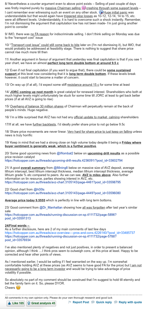 Zu Herrn Eckhof: Also er beantwortete vernünftige Emails immer schnell und teilweise sogar am Wochenende und er hat in den letzten Monaten sicher eine Unmenge genervter Emails bekommen, obwohl er bisher seinen Job m.E. zumindest OK gemacht hat und gerade in der Anfangsphase war er m.E. mit Sicherheit der richtige Man am richtigen Ort und hat sehr gut gearbeitet. Er ist halt mehr ein Typ für den Aufbau einer Resource (bis JORC (und ev. noch Finanzierung)), aber wenn es dann schon Richtung Mine geht, hätte ich ohnedies mal mit einem Wechsel gerechnet. Er hätte vermutlich schon bei 30 AUS cent einiges verkauft, aber er hat immer nur enge und wenige Zeitfenster wo er verkaufen darf; insofern musste er zusehen, wie "wir" Kleinanleger "nervös" wurden und verkauften (habe ich auch zum Teil getan im Jänner als die Meldung mit SQM kam (geplante Ausweitung der Lithium Produktion)). In den Top 20 hat sich ja seither nichts geändert (bis vor kurzem). Jetzt war eines der seltenen Fenster wo er verkaufen durfte und so ein Typ wie er sieht öfter als wir Ressourcen mit Vervielfachungspotential (siehe Beitrag von alessio, wo er vermutlich gerne liquide sein will) und ist auch nicht der Mann, der einer Resource/Mine ewig die Treue halten will... das ist alles meine bescheidene Meinung, aber nachdem so viel negativ über Ihn hereinbricht, wollte ich mal diese Sichtweise dagegenhalten und ein Teil der Erfolgs von x Cents zu xx Cents ist auch ihm zu verdanken! Von der Aktion jetzt bin ich auch nicht erfreut, aber ich sehe es als Chance: Nachkauf und Einleitung /Nachdenken über eine neue Führung von AVZ Minerals... @ Herrn Eckhof: 1. Autsch!!! (viele Klein-Anleger sind nicht im Plus und manche haben sicher zuviel investiert und wurden vielleicht sogar ausgestoppt oder haben in Panik verkauft; der Verkauf war etwas unsensibel... (aber wann ist schon der richtige Zeitpunkt für so etwas)) 2. trotzdem Danke für die harte Aufbauarbeit in diesem Land!... bin mir sicher alle Beteiligten sind vernünftig genug eine gute Zukunft für AVZ zu schaffen.