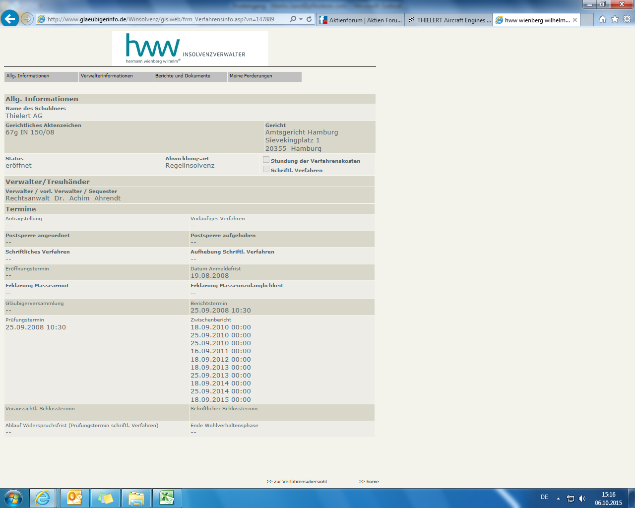 Seit 01.08.2008 ist die THIELERT AG in Insolvenz und warum wird nun wieder ein Zwischenbericht erbracht ( 18.09.2015 ).