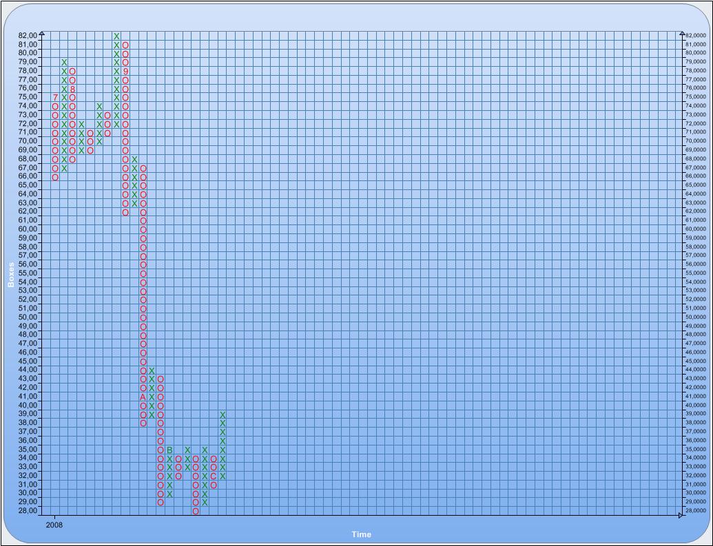 Dennoch signalisiert der P&F Chart am 19.12.2008 einen Trendwechsel mit Doppelminus. Es ist damit zu rechnen, dass wohl kurzfristig mit Kursrückschlägen zu rechnen ist. Mit einer wirklich deutlichen Kurserholung ist in naher Zukunft wohl noch nicht zu rechnen, die Kursentwicklung bleibt nach wie vor noch unsicher.