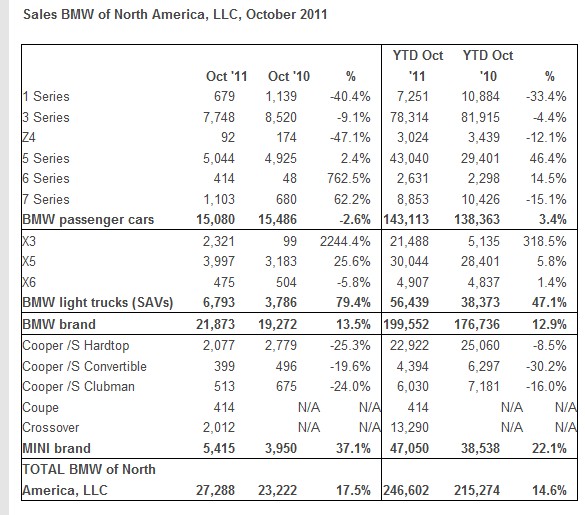 Bei der Kernmarke BMW legten die Verkaufszahlen im Oktober um 6,8% auf 115.136 Einheiten zu. Der BMW 5er stand weiterhin klar an der Spitze seines Segmentes, aber auch der neue BMW X3 erfreute sich großer Beliebtheit. Der Absatz des neuen Modells stieg um mehr als das Vierfache. Die Marke MINI verzeichnete im vergangenen Monat mit 23.839 Fahrzeugen einen Rekordabsatz (+16,2%).