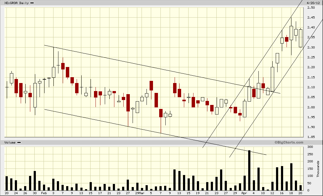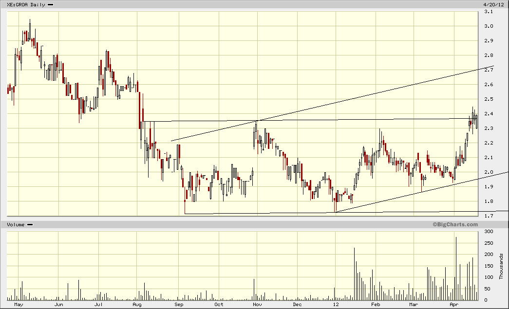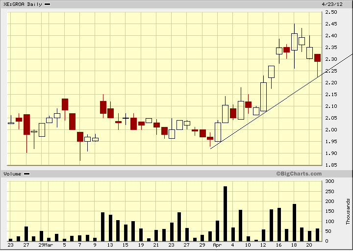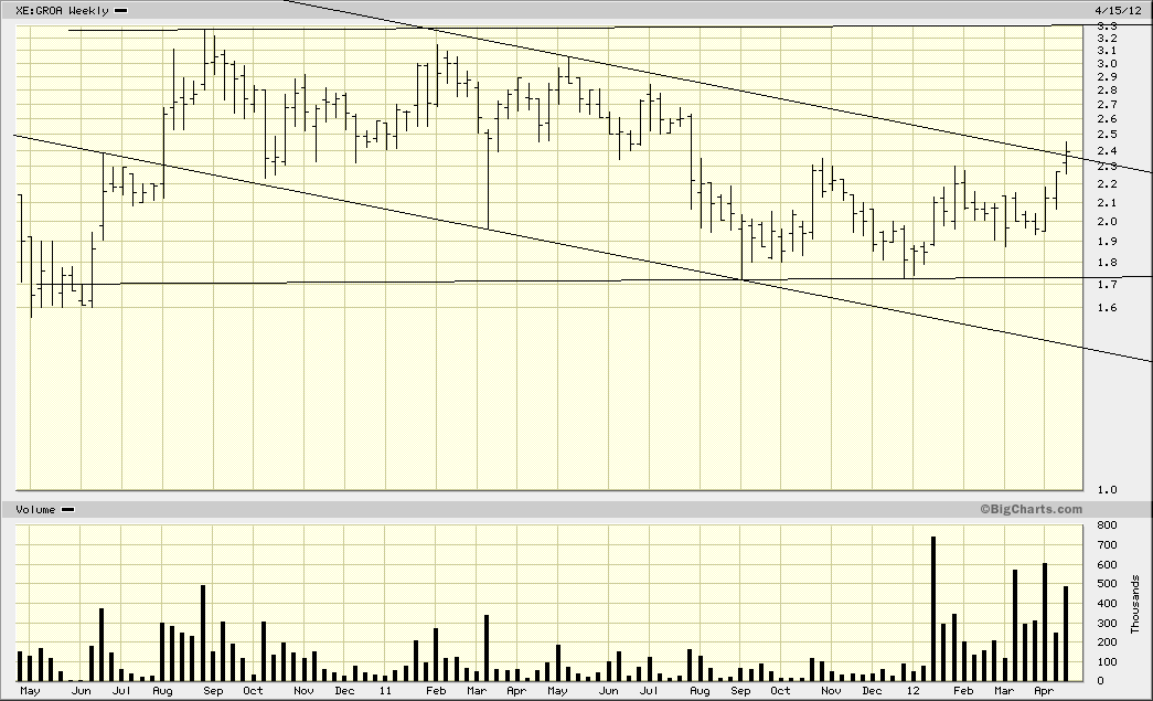 Widerstand bei ca. 2,37 EUR mehrfach nach oben durchbrochen. Dadurch Trendwechsel zum kurzfristigen Aufwärtskanal (Range ca. 1,96 EUR bis 2,7 EUR). Nächster Widerstand somit aktuell bei 2,70 EUR.