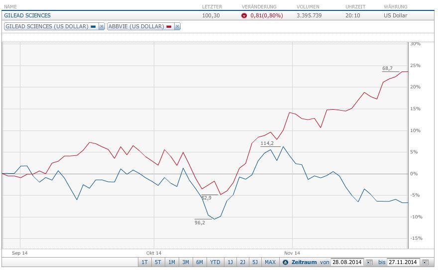 seit 2013, der hier nicht dargestellt wird, zeigt ganz deutlich, daß sich Gilead und Abbvie ziemlich synchron zu bewegen scheinen, erst seid Ende Oktober 2014 zeichnet sich eine deutliche Schere im Chartverlauf der beiden Unternehmen ab. Jim Kramer (CNBC) hat bereits letzte Woche gesagt, daß der Kurs von Gilead solange nach unten zeigt, bis wir Abbvie-Preise sehen. Scheint jedenfalls so zu sein, daß beide Kurse stark miteinander zu tuen haben.