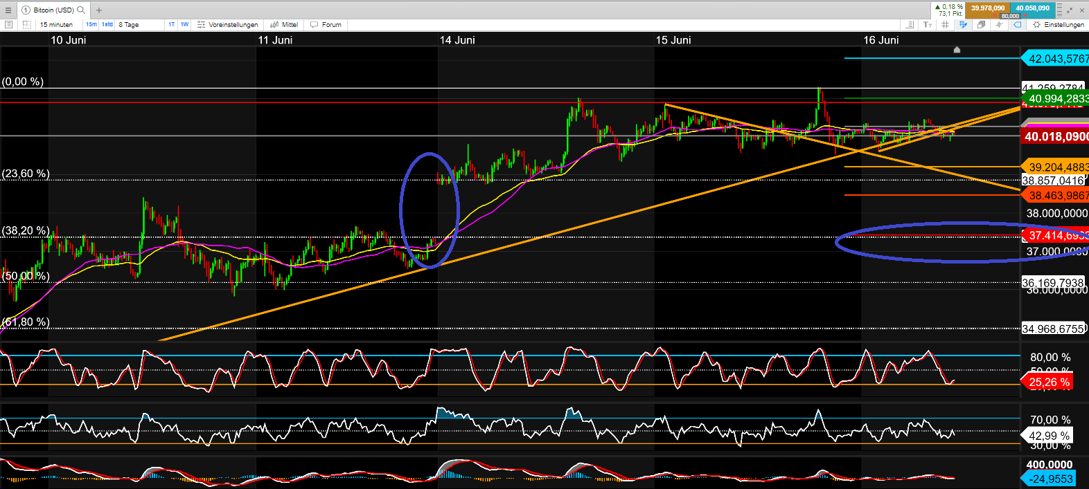 erkennt man gut, dass der Dax aktuell leicht überkauft ist und dass sich "zeitnah" eine Korrektur andeutet, was jedoch nicht ausschließt, dass wir vor einer möglichen Korrektur noch Kurse über 16.000 sehen werden.