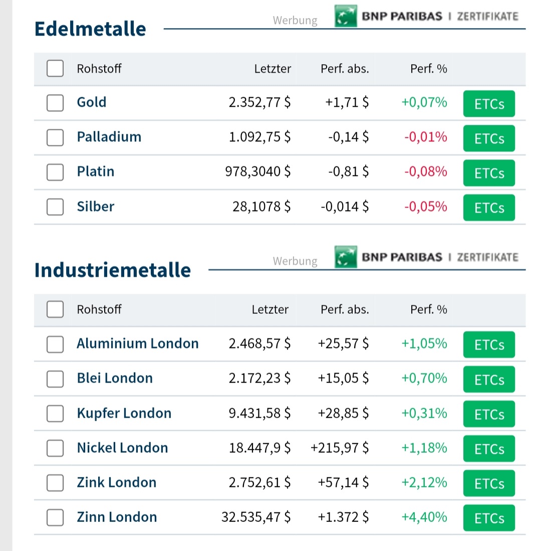während die "Industrie"-Edelmetalle Pt, Pd, Ag steigen. Ich denke die weissen drei werden ausser für KFZ auch wieder verstärkt für Geldanleger interessant. Warum das teure Gold kaufen wenn die weissen Metalle im Verhältnis viel billiger sind?