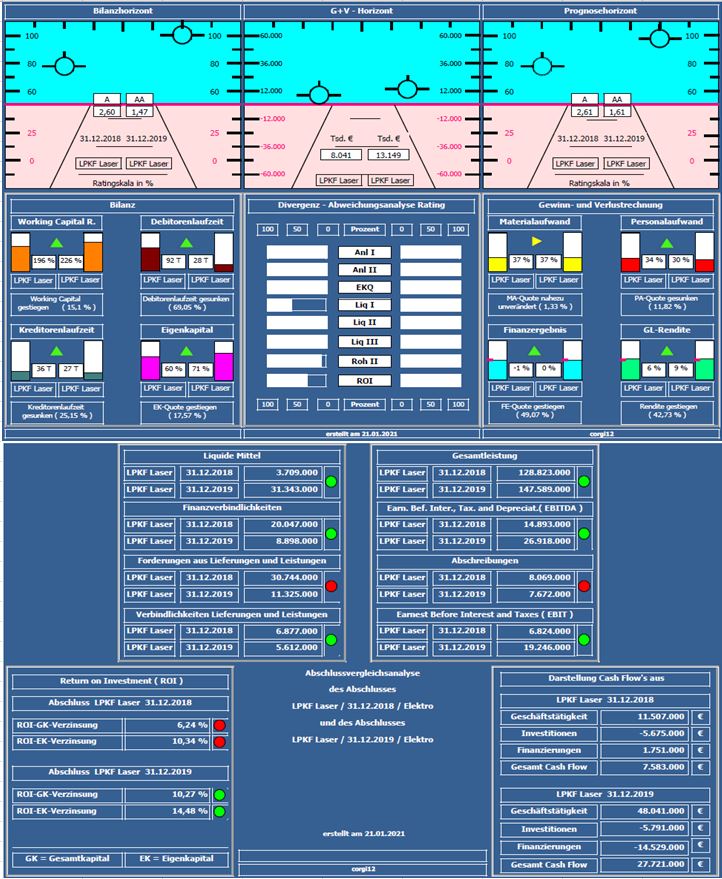 Positiv: Gesamtleistungssteigerung ca. +14,5%; Entwicklung der Nettofinanzmittel von -16 Mil. € auf +22 Mil. € und damit verbunden Verbesserung der Liquidität I-Kennzahl; Rohertrag II-Quote minimal durch relativ verminderte Personalaufwendungen verbessert. Erheblich gesteigerter Gewinn verbessert den Return on Invest erheblich;