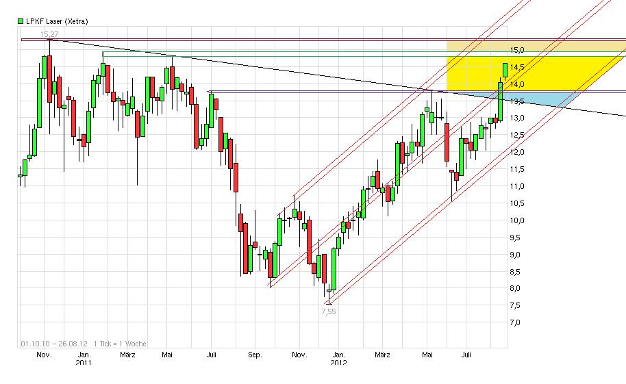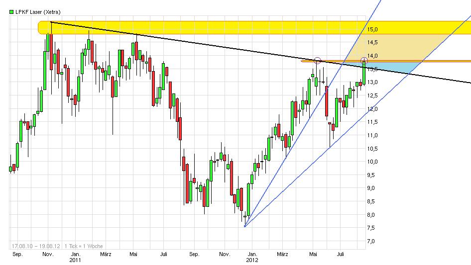 Also bei der aktuellen Marktkapitalisierung von 162,0 Mio. € und einem Freefloat klar über 80% und den jetzt deutlich gestiegenen Handelsvolumina, würde ich mal die Wahrscheinlichkeit der TecDax Aufnahme eher mit 98% ansetzen. Da müßte schon ein Wunder bei Singulus (aktuelle MK 85 Mio) und Gigaset (aktuelle MK 65 Mio ) passieren oder LPKF eine Gewinnwarnung aus dem Nichts zaubern, um das noch zu verhindern. Genau aus diesem Grund haben ja auch die institi. Anleger in den letzten Wochen außerbörslich und börslich sich schonmal dick eingedeckt mit den Papieren, bevor nach der TecDax Aufnahme die breite Masse der Privatanleger auf diesen soliden Wert aufmerksam wird. Wenn ich sehe wie LPKF jetzt fast jeden Tag von Jahreshoch zu Jahreshoch springt, dann scheint das Top von Ende 2010 vielleicht doch eher ereicht zu werden als ich es eigentlich auf der Rechnung habe. Hatte das eher für Ende des Jahres auf dem Radar bislang. Wobei der Knackpunkt wohl nicht das erreichen der Marke sein wird, sondern diese auch nachhaltig dann zu nehmen. Eigentlich ist auch mal wieder eine Konsolidierung des laufenden starken Anstiegs notwendig. Würde mich also wundern, wenn man wie Butter durch die 15,27 gehen würde ohne vorher mal wieder auszuatmen. Interessant wird es auch bei 15,10 werden. Wäre dann genau eine 100% Kurssteigerung seit dem Low 7,55 von Ende 2011. Vielleicht interessant für die Fibo und Retracement Liebhaber. Sollte der Kurs die Marke von 15,27 überwinden, dann wäre für mich die Marke um die 16,75 interessant. Wenn man unterstellt der laufende Move seit dem Start bei 10,5€ würde die gleiche Länge haben wie der vorhergehende Move von 7,55-13,8 dann käme man auf eine Ausdehnung von 6,25€ bzw. zu einem Kurs von 16,75. Aber erstmal eins nach dem anderen. Um sich Gedanken zu machen was nach 15,27 kommt sollte man jetzt wenigstens erstmal bis an diese Marke überhaupt kommen ;)