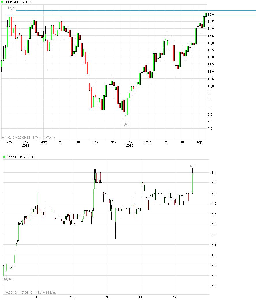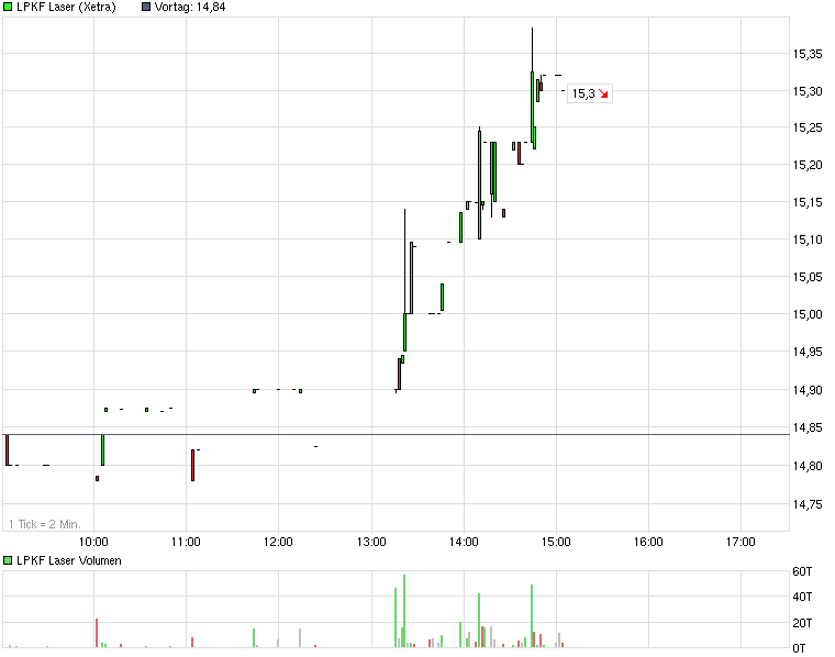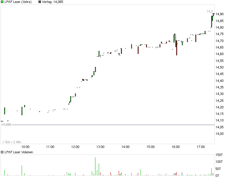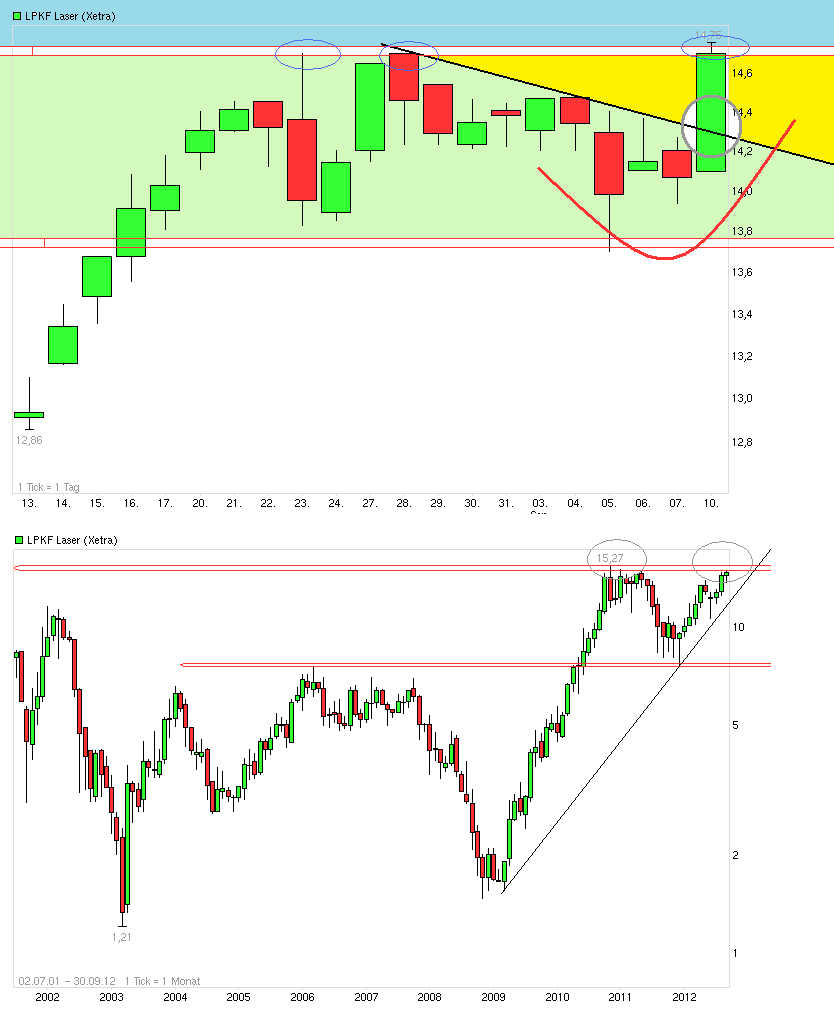 Am Tag der Zahlenbekanntgabe kaufte ich zu 13,35 Euro, weil neben den sehr guten Zahlen auch das charttechnische Verhalten überzeugte. Primär das hohe Kaufinteresse war ein positives Signal. Anschließend stieg LPKF Laser bis 14,50 Euro und ging in eine Konsolidierung über. Innerhalb dieser erfolgte zu 14,18 Euro die Positionsvergrößerung, weil sich an den fundamentalen Aussichten nichts geändert hat und die Aktie ihre bullische Preisreaktion beibehielt. Zudem stützte die Aufnahme in den TecDax. Nun heißt es die Gewinne möglichst lange laufen zu lassen und eine schöne Aufwärtsbewegung mitzunehmen!
