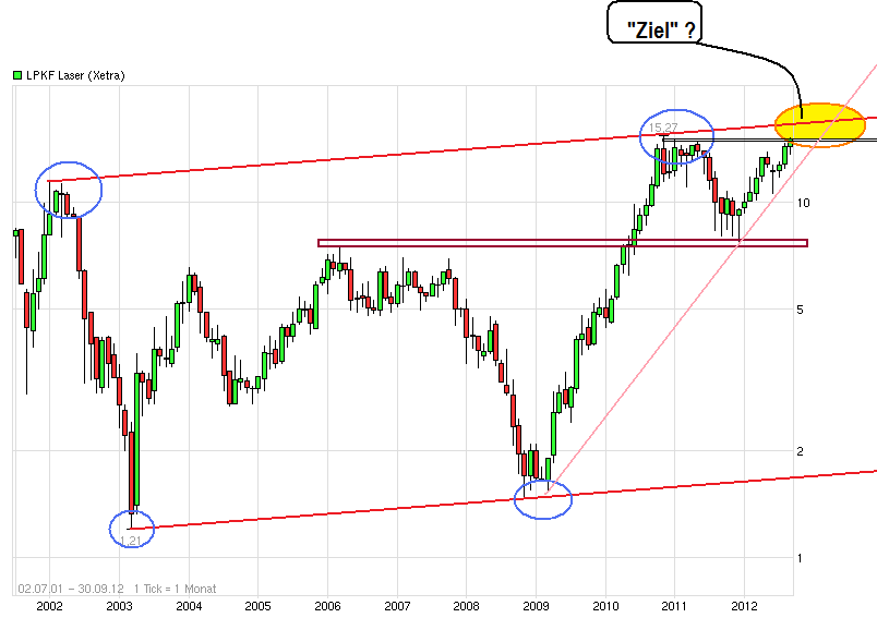 Wie im Zuge der Q1-Zahlen erläutert, fielen diese nicht so gut aus. Dafür hat LPKF Laser im zweiten Quartal deutlich an Fahrt aufgenommen und konnte ein hervorragendes Halbjahresergebnis präsentieren. Zwischen April und Juni wurden Erlöse von 29,8 Mio. Euro (+27,5%) erwirtschaftet und ein Nettogewinn von 3,647 Mio. Euro (+50,8%) erzielt! Daher beliefen sich die Umsätze nach sechs Monaten auf 50,324 Mio. Euro (+33,6%). Gleichzeitig stieg der Ertrag nach Steuern um 31,3% auf 0,42 Euro/Aktie. Für das Wachstum waren die Bereiche LDS und Other Production Equipment (Kunststoffschweißen und Solar) verantwortlich. Mittlerweile erzielt LPKF Laser gut 50% seiner Erlöse in Asien und spürt die europäische Schuldenkrise bisher nicht. Zudem hat die Diversifizierung zugenommen und die Lasersysteme richten sich an Unternehmen, die neue Maschinen aus Kostengründen oder zur Miniaturisierung ihrer Produkte erwerben und nicht primär für Kapazitätserweiterungen einkaufen. Daher wurde die Jahresprognose eines Umsatzes von 100 – 105 Mio. Euro sowie einer EBIT-Marge von 15-17% bestätigt. Es ist aus meiner Sicht möglich, dass bei einem guten Start ins vierte Quartal im Zuge der Ergebnisse zum dritten Quartal noch die Prognose angehoben wird. Die Visibilität sind zwei bis drei Monate. Ohnehin wäre die Guidance Makulatur, wenn LPKF Laser neue Großaufträge akquirieren kann, die bisher nicht in der Prognose beinhaltet sind. Analysten schätzen den Ertrag in 2012 auf 1,08 Euro/Aktie, der in 2013 auf 1,26 Euro/Aktie steigen soll. Damit beträgt das KGV nur 11.