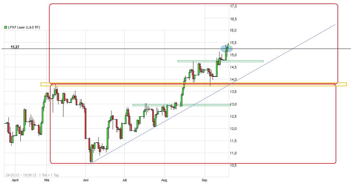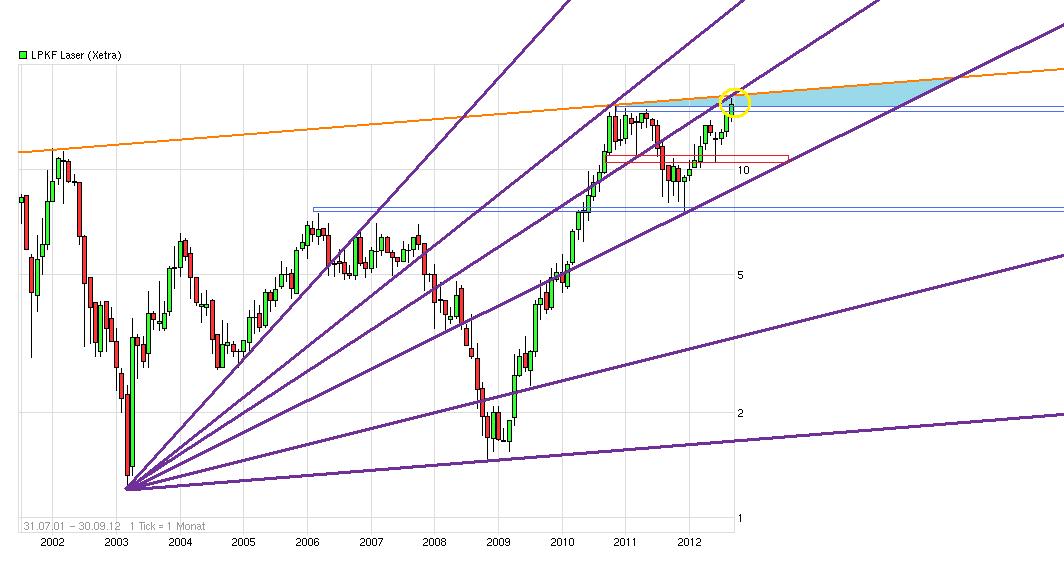 Also momentan muß man einfach sehen, daß viele insitit. Anleger sich durch den jüngsten TecDax Aufstieg und die baldige Indexumstellung mit LPKF erstmal neu positionieren müssen. Speziell die passiven Fonds sind kurzfristig noch nicht hinreichend eingedeckt. Somit ist natürlich aktuell auch noch ein Sondereffekt vorhanden der nicht nur fundamental getrieben ist. Das LPKF Management ist eigentlích immer konservativ mit seinen Prognosen. Von daher erwarte ich, daß man die aktuelle 2012 Prognose noch anheben wird mit verkünden der Q.3 Zahlen, da man schon bei Hj.1 Zahlen sehen konnte wie gut es läuft und erst jüngst immer wieder bestätigt wurde vom Management wie gut es auch weiterhin läuft. Angesichts vieler neuen Einsatzmöglichkeiten der LPKF Produkte denke ich, daß auch 2013 weiterhin das Tempo hoch gehalten werden kann. Somit schaue ich auch jetzt weniger auf das 2012KGV, sondern schon auf das 2013 er KGV (http://www.deraktionaer.de/aktien-deutschland/lpkf-laser-finanzchef---profitabilitaet-geht-vor-wachstum--18639459.htm => "..LPKF Laser befindet sich in nahezu allen Belangen auf Kurs. Die Bewertung bietet mit einem 2013-er KGV von 10 angesichts der zweistelligen Wachstumsraten noch viel Luft nach oben...). Schließlich ist in wenigen Monaten 2012 vorbei und 2013 gilt es einzupreisen. Und wenn das Management Recht behält, dann kann der Kurs in einem positiven Gesamtmarktumfeld durchaus auch 2013ff weiter Freude bereiten ( => LPKF-Finanzvorstand Kai Bentz : ".. Wir haben bisher eine Prognose bis 2014 veröffentlicht. Diese sieht ein Umsatzwachstum von rund zehn Prozent pro Jahr und eine EBIT-Marge zwischen 15 und 17 Prozent vor. Upsidepotenzial ergibt sich hier beispielsweise durch neue Großaufträge...." )