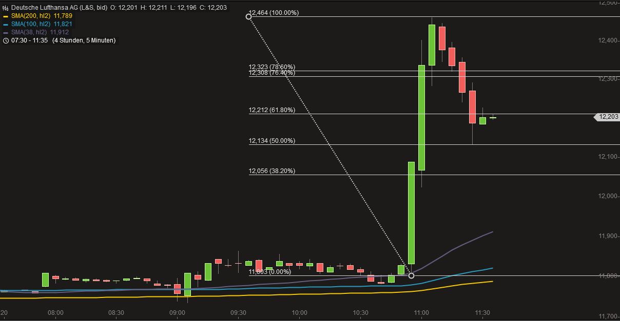 Lufthansa springt auf ein neues Tageshoch, aktuell +5 %. Gerüchte über einen möglichen Einstieg eines Investors