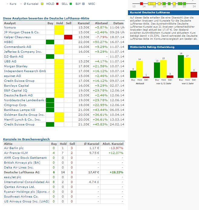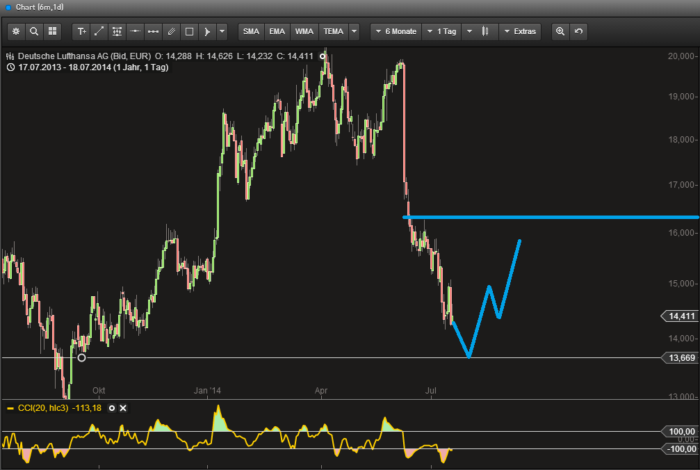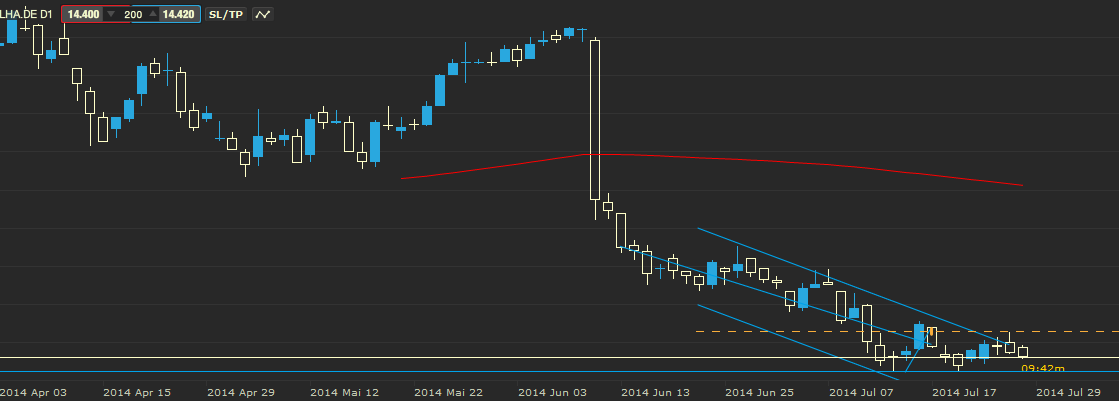 17.07.2014 (www.4investors.de) - Wird bei der Lufthansa-Aktie eine breite und starke Unterstützungszone rund um die Marke von 14 Euro zur Trendwendezone? Gestern jedenfalls gelangen der DAX-notierten Luftfahrtaktie erneut Gewinne, nachdem der Lufthansa-Aktienkurs am Montag bei 14,158 Euro aus der Abwärtsbewegung nach oben drehte. Das bisherige, gestern erreichte Erholungshoch liegt bei 15,025 Euro, der Schlusskurs des Papiers ist bei 14,96 Euro knapp darunter notiert. In dieser Zone bewegen sich auch die Notierungen auf den außerbörslichen Handelsplattformen am frühen Donnerstagmorgen vor XETRA-Handelsstart.