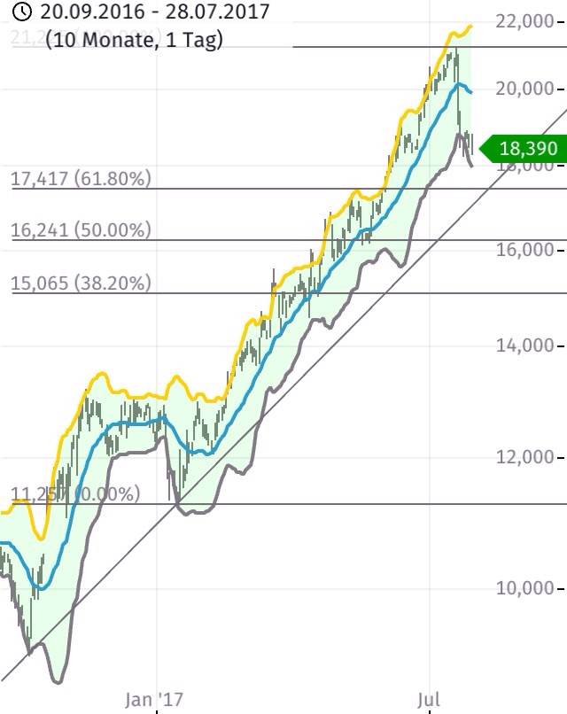 Nach meiner ElliottWellen Analyse ging die III Hauptwelle der 200% Extension exakt auf 21.16 und interessanterweise kam der Kurs auch bis genau hierher; Ein retracement in der IV Korrekturwelle sollte jetzt mindestens ! bis zur 61% Linie bei 17.4 gehen bevor die letzte V Welle nach oben kommt welche in der Regel nie versagt und zu neuen Höchsständen führt. Kann aber nach EW noch in der III sein und noch beliebig nach oben gehen, Charttechnik ist dehnbar;