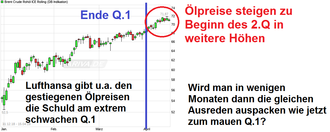 Vernüftige Hedging-Geschäfte zur Absicherung scheint man gegenwärtig wohl nicht zu machen, weil man scheinbar denkt Treibstoffpreise können nur fallen, oder wie? Der Schuß ging nach hinten los. Welche weiteren Kerosinpreise erwartet man denn für das Restjahr, wenn man nun die Prognose weiter aufrechterhalten will? Wirkt auf mich eher unwahrscheinlich, daß man hier im Jahresverlauf nicht die Prognose doch noch nach unten adjustieren wird mit dem Schrott-Q.1 im Rücken. Q.1 hat ja schon gezeigt, daß man offenbar zu blauäugig ist und die Preisentwicklung eher unterschätzt bei seinen Prognosen. Und ein kleiner Blick auf die Entwicklung der Ölpreise in den letzten Wochen zeigt, daß auch das 2. Quartal mit sehr hohen Treibstoffkosten direkt beginnt. Umkehr der Treibstoffpreisentwicklung ist also nicht erkennbar. Von daher würde mich nicht wundern, wenn man zum Halbjahr die nun krampfhaft aufrechtgehaltene, aber eben sehr ambitioniert wirkende Jahresprognose dann doch nach unten korregieren wird. Wäre es also nicht vielleicht besser man würde direkt die Jahresprognose jetzt mit den mauen Q.1 Zahlen leicht nach unten anpassen? Dann hätte man die Kröte früh geschluckt und das Thema wäre durch und man könnte im günstigsten Fall sogar die Prognose im 2.Hj. nochmal anheben.