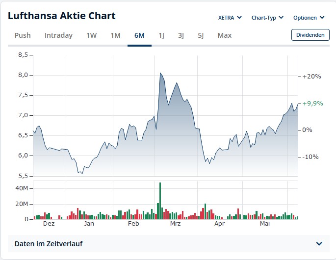 Dazu kommt ja noch, daß man sich üblicherweise für einen Handelplatz entscheiden muß. Das wäre für die Lufthansa dann welcher? Der XETRA-Handel findet montags bis freitags von 9.00 - 17.30 Uhr MEZ statt ... da kriegt man ganz OK mit, wenn die Amis aufwachen und schlechte Laune verbreiten, aber wenn "sonstwo" (für uns "mitten in der Nacht") irgendetwas passiert, dann kommt man am XETRA etwas spät. Handelszeiten Börse Hamburg von 8:00 bis 22:00 Uhr und im elektronischen Handelssystem LS Exchange (Market Maker) von 7:30 bis 23:00 Uhr ... aber da wird (mit Lufthansa) im Vergleich zum XETRA eben wenig Umsatz gemacht und das sorgt für größere Schwankungen (und somit für Chancen im eigenen Knie ausgestoppt zu werden).
