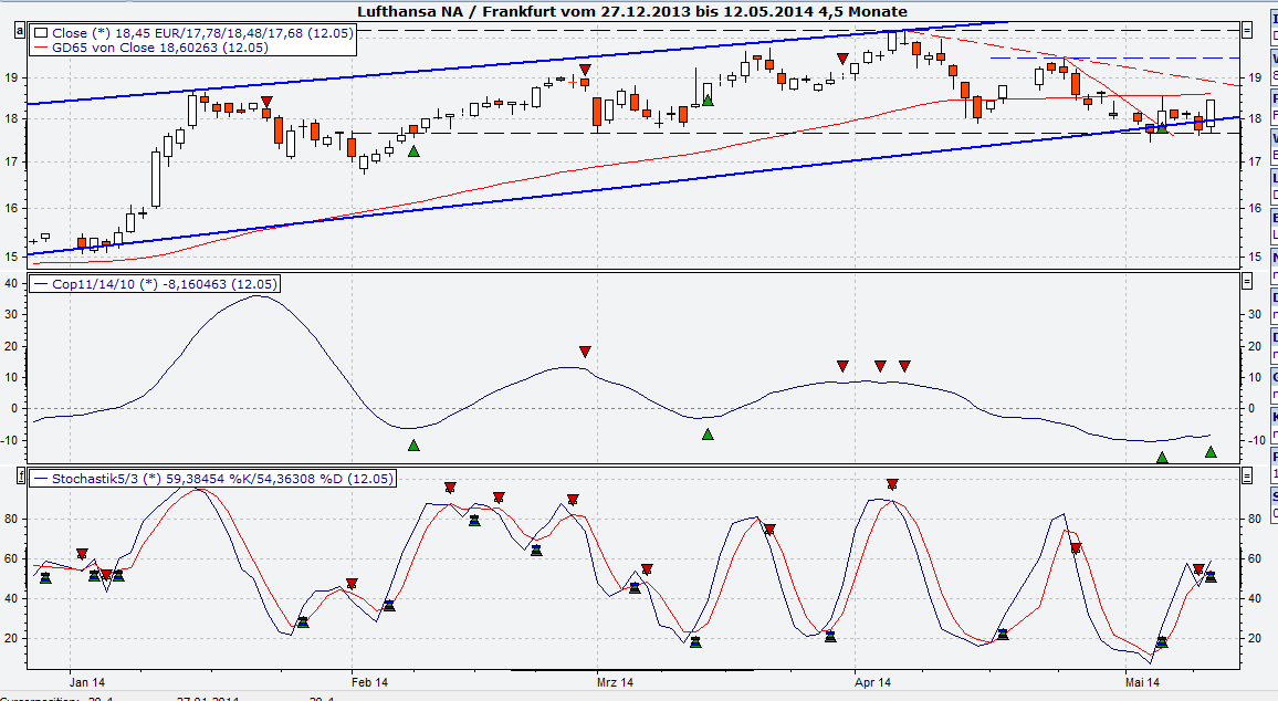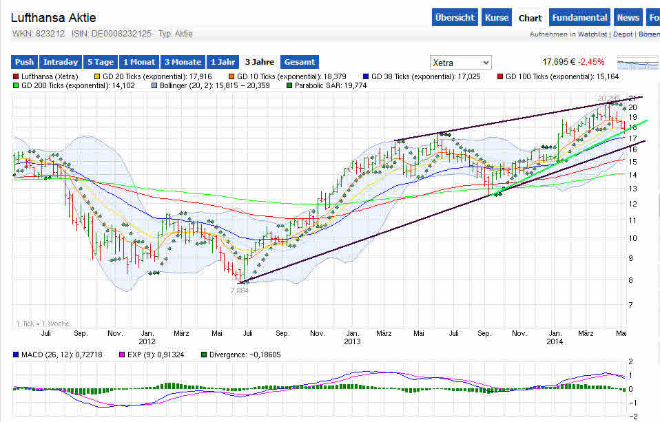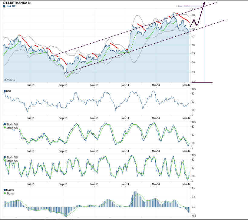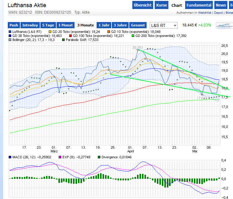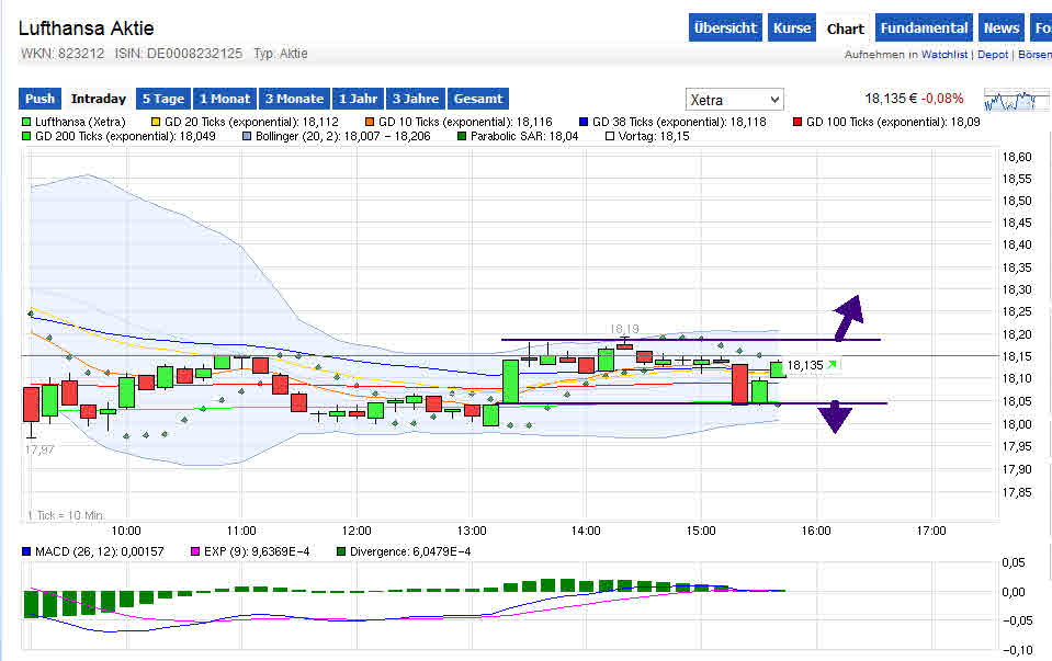 Da baut sich ein ganz schöner Druck auf; die Vereingung des Bollinger Bandes signalisiert eine Explosion, und ich hoffe und rechne damit, dass diese den Kurs nach oben katapultieren wird und zwar in den Bereich von zunächst 18,50 € und danach weiter!