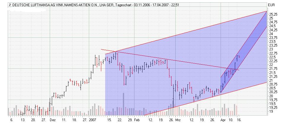 Für das Gesamtjahr 2007 habe die Deutsche Lufthansa ihre Prognose für das operative Ergebnis erhöht und erwarte nun 1 Mrd. Euro bis 1,3 Mrd. Euro. Dieses Ziel sei bisher erst für das GJ 2008 anvisiert worden. Durch Programme zur Produktivitäts- und Ertragssteigerung (Bekanntgabe von Details spätestens im Sommer 2007) solle die Ertragskraft weiter gesteigert werden.