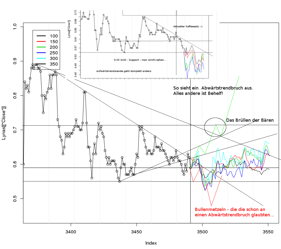 Nun mal ehrlich: Ist der rote oder der grüne Verlauf realistischer? Wenigstens eine Konsolidierung - wie es R vorschlägt wäre für mich realistisch.
